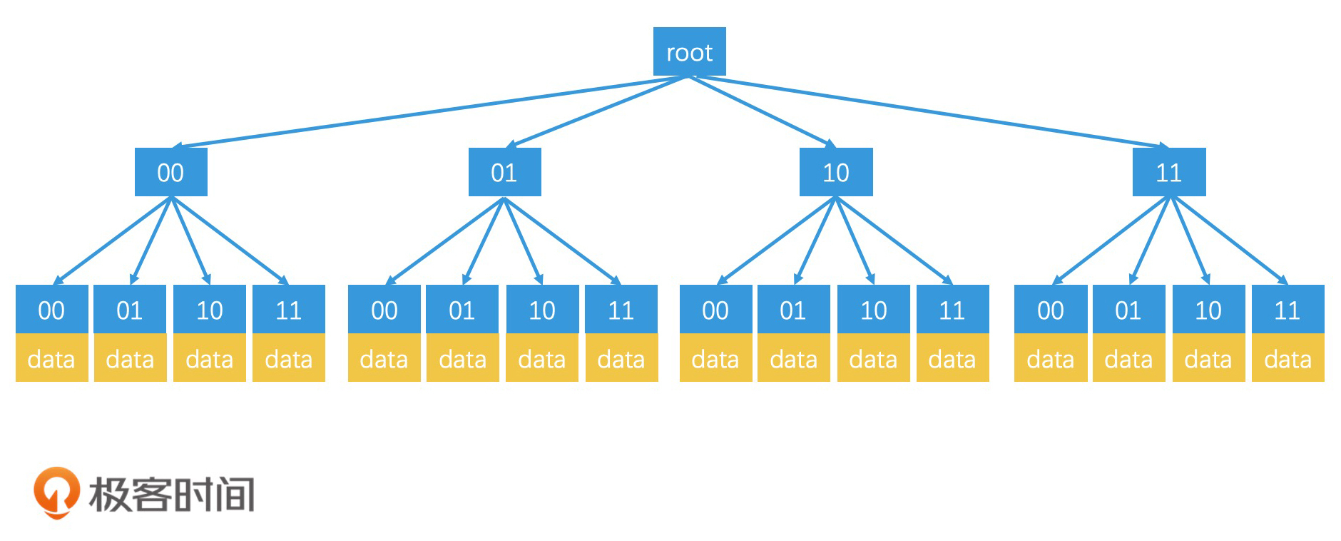 上面,我们都是用二进制编码来说明的。你可能会问,如果我们使用了GeoHash编码方式,是否也可以用类似的检索技术来索引呢?当然是可以的。实际上,对于字符串的检索,有一种专门的数据结构,叫作前缀树(Trie树)。