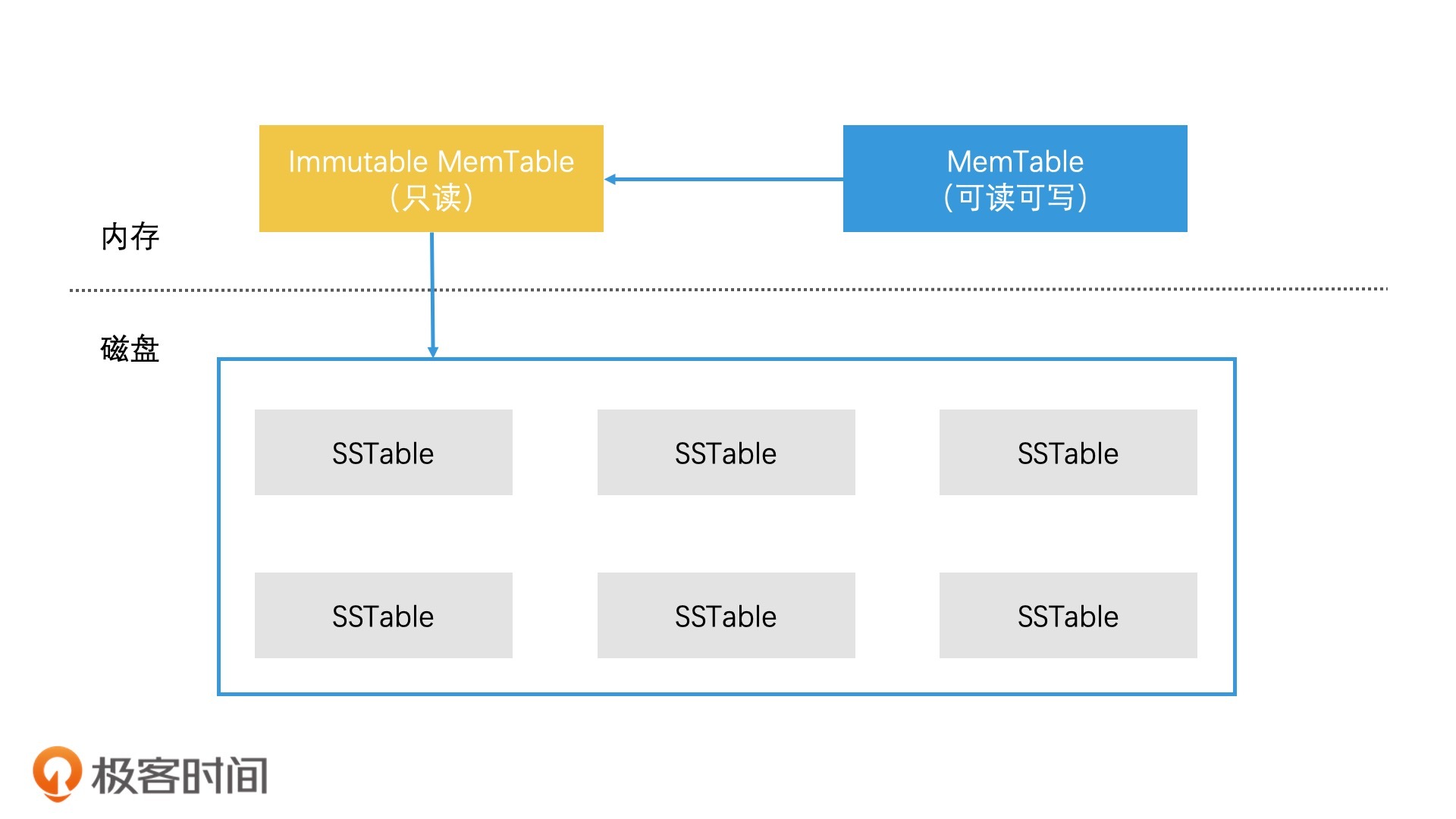 具体来说就是,当MemTable的存储数据达到上限时,我们直接将它切换为只读的Immutable MemTable,然后重新生成一个新的MemTable,来支持新数据的写入和查询。这时,将内存索引存储到磁盘的问题,就变成了将Immutable MemTable写入磁盘的问题。而且,由于Immutable MemTable是只读的,因此,它不需要加锁就可以高效地写入磁盘中。