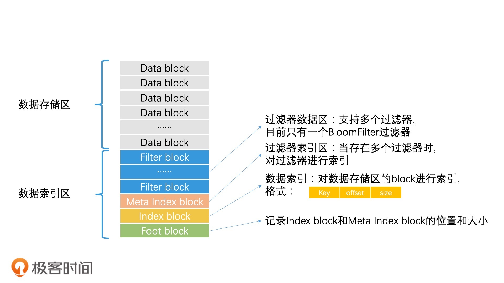 首先,LevelDB使用索引与数据分离的设计思想,将SSTable分为数据存储区和数据索引区两大部分。